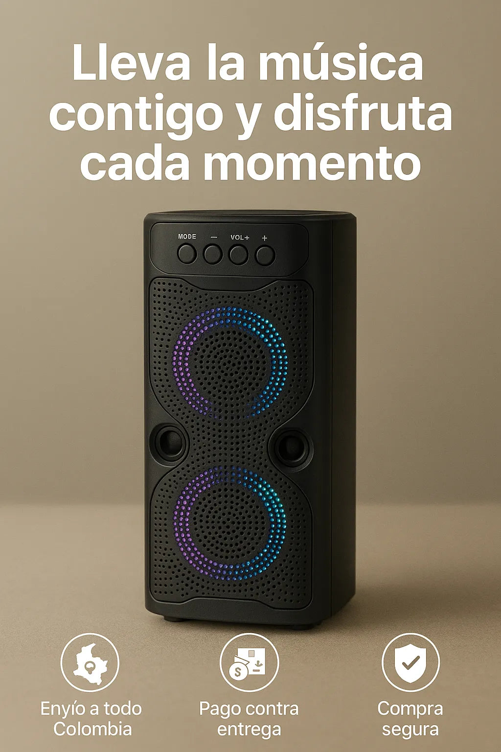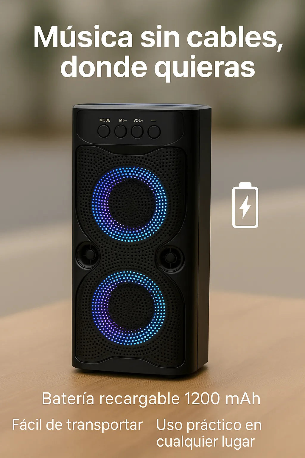 - Parlante portátil Bluetooth con luces LED integradas.