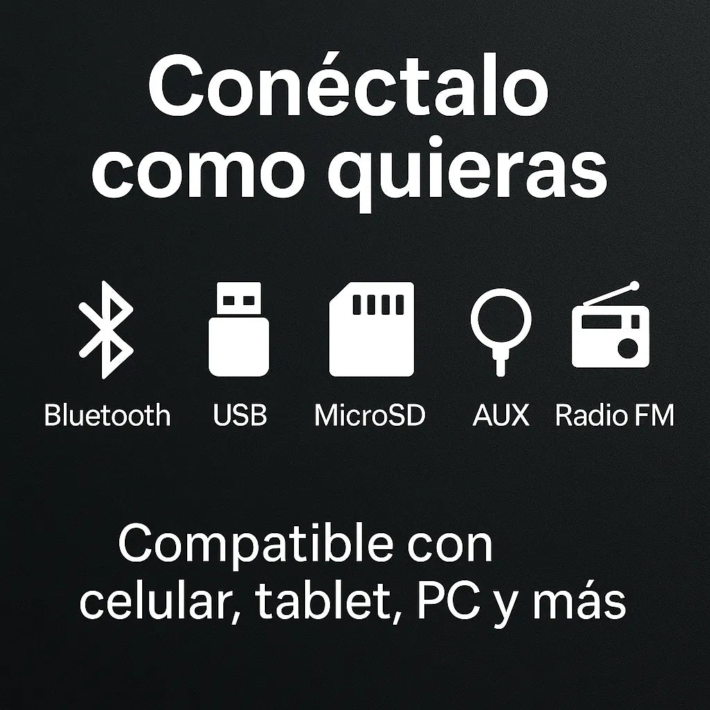 - Múltiples opciones de conexión: Bluetooth, USB, MicroSD, AUX y Radio FM.